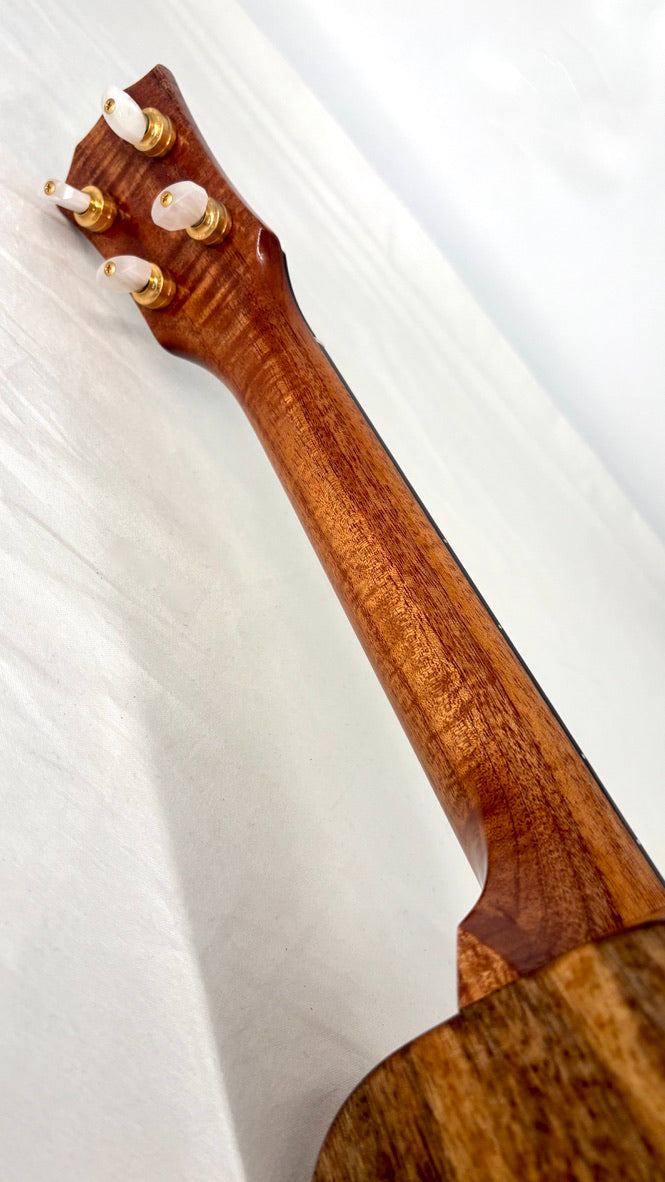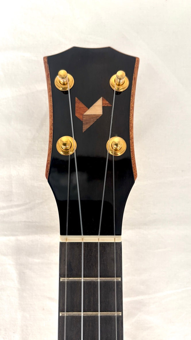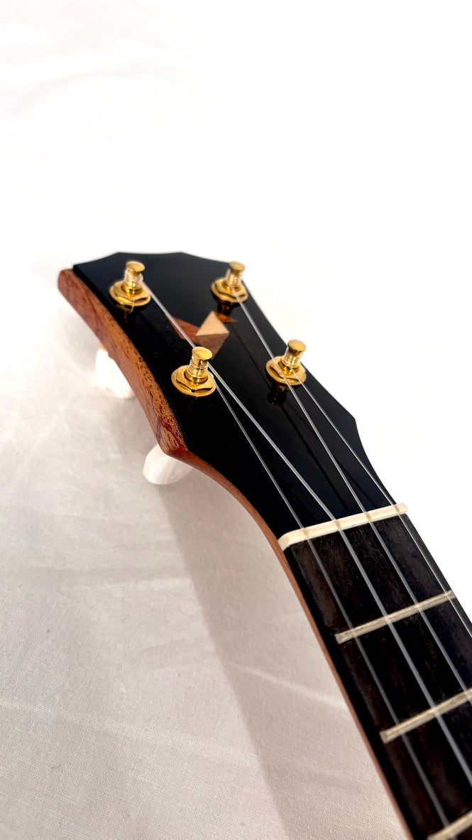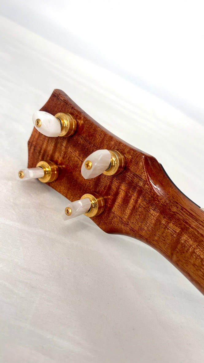 Packt man eine Rebel aus dem recht bunten, aber gut gepolsterten Gigbag aus, fällt einem zunächst die makellose Verarbeitung und das spektakuläre Mango auf. Die elegant gestaltete Kopfplatte mit dem stylischen Logo trägt vergoldete Gotoh UPT Tuner, für mich die besten Ukulelenmechaniken, die es gibt.