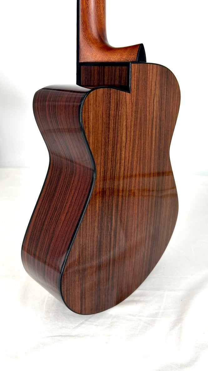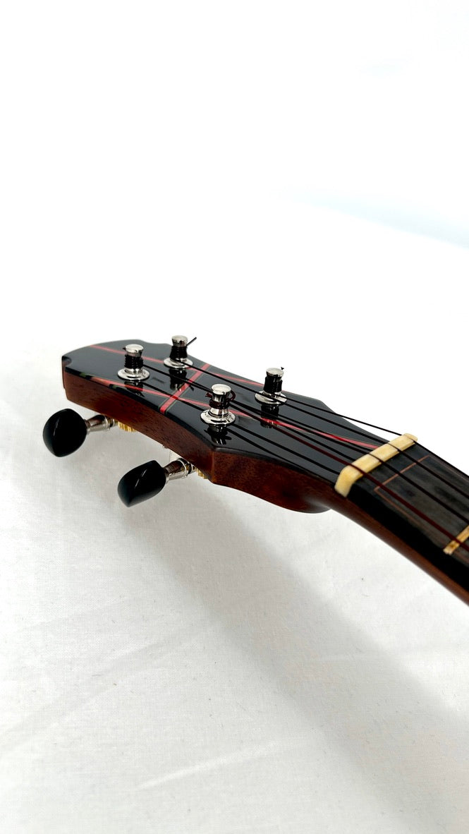 In diesem Jahr wurden die ersten Hozen-Ukulelen dieser Art gebaut. Hozen hat das Design des Korpus etwas verändert, vor allem im Bereich des Cutaways. Die wichtigen Features Bevel und Soundport sind natürlich geblieben.