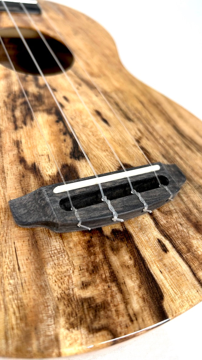 Die Ukulelen sind mit klaren Fluorcarbonsaiten bespannt, die Bespielbarkeit ist durch den niedrigen Saitenzug und die flache Saitenlage hervorragend, die Ukulele spielt sich (fast) von selbst.