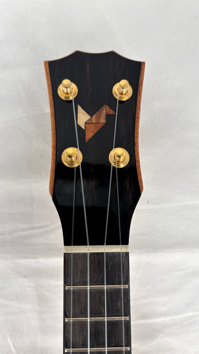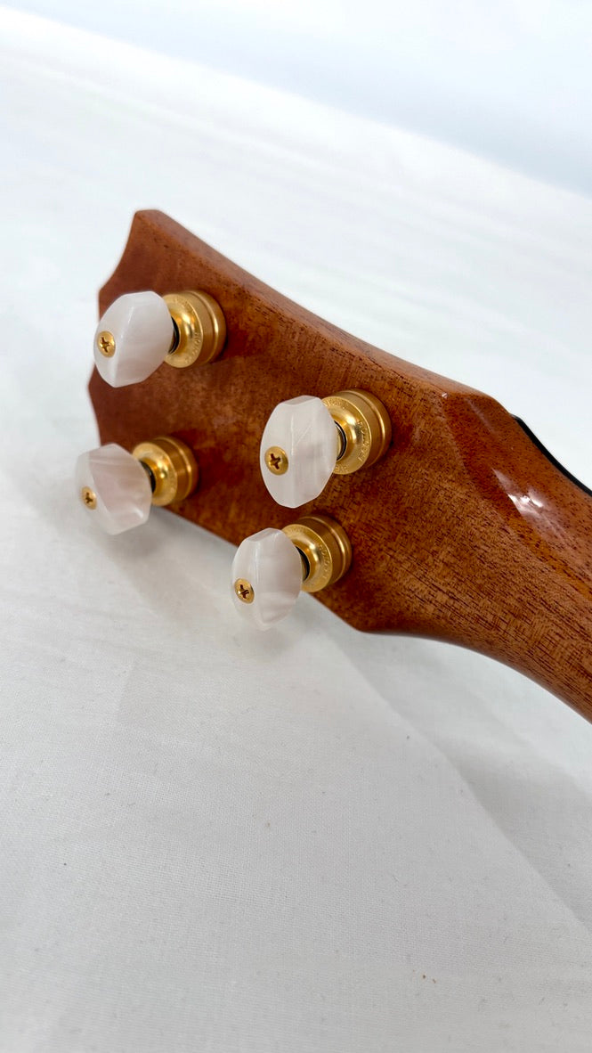 Packt man eine Rebel aus dem recht bunten, aber gut gepolsterten Gigbag aus, fällt einem zunächst die makellose Verarbeitung und das spektakuläre Mango auf. Die elegant gestaltete Kopfplatte mit dem stylischen Logo trägt vergoldete Gotoh UPT Tuner, für mich die besten Ukulelenmechaniken, die es gibt.